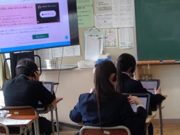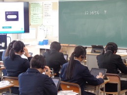 2時間目、2年1組の様子です。ヘッドホンをつけて聞き取りながら解答を進めています。