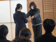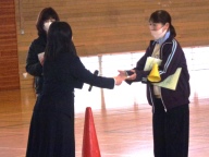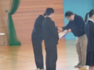 続いて3年生生徒を代表して学年委員が3年生担当の先生に「感謝状」を手渡しました。3年間ずっと一緒だった先生、今年度1年一緒の先生とこちらも様々ですが、3年生のために全力で向き合った先生に感謝の気持ちを伝えました。