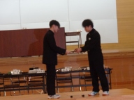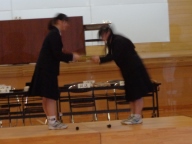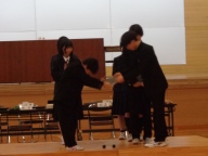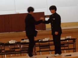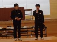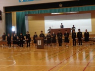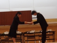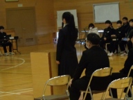 総会後、生徒会本部役員と専門委員長の引継ぎ式がありました。設けた壇上で旧役員・委員長が感謝と励ましの言葉を、新役員と委員長が労いとこれからの抱負を伝えました。ファイルの引き渡し後、ハイタッチやぐータッチ、ハグなどする姿が見られました。今の一中の雰囲気を表す姿でした。