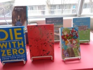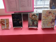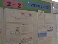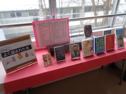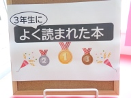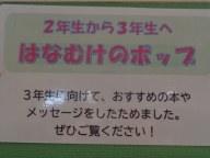 図書室前には「3年生がよく借りて読んだ本」が紹介せれています。職員室前廊下には後方図書委員会1・2年生の3年生に対するメッセージとともにおすすめの本が展示されています。その上には2年生がおすすめの本のポップを掲示しています。紹介分の中には3年制へのメッセージも含まれています。
