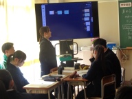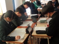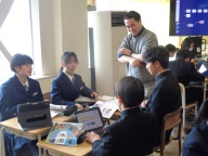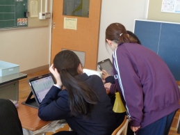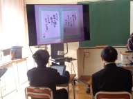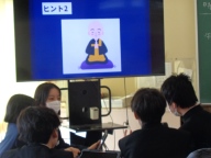 3時間目は社会の授業です。歴史分野で室町時代まで学習した1年2組。今日は「〇〇時代クイズ」を自分たちで作り、クラスのみんなで答え合う、楽しい授業です。グループに決められた時代にまつわる人物や出来事を3つのヒントで解き明かします。その時代背景を示す第1ヒント、出来事や人物に関係の深い第2、第3ヒントもつくり、クラスに示します。大盛り上がりで1年間の復習がしっかりとできました。