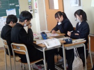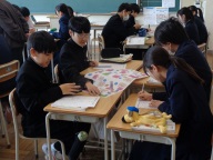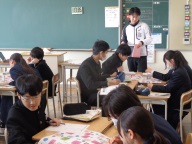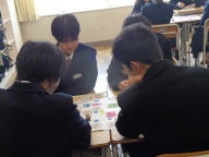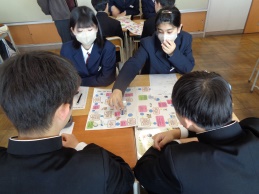 授業最終日の今日ですが、授業改善を目指す取組を進めています。1時間目、1年1組で家庭科の公開授業を行いました。学年の終わりに「よりよい住生活を目指して」を学んできた1年生。今年度最後の授業は今まで学んできたことを振り返り、よりよい住生活を目指す意欲を持つことをがねらいです。学んできたことの振り返りは「住生活改善すごろく」を使いました。すごろくで、止まってきたマスにある住生活に関する問いを答えながら、見につけたことを確認していきます。すごろくは楽しそうに、問題は真剣に考える姿が見られました。
