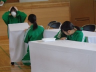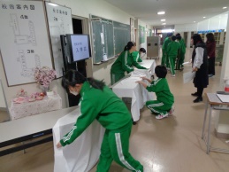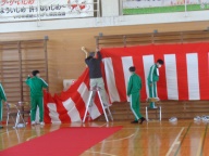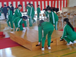 午前の最後は入学式準備です。3年生は体育館で式場づくり、2年生は来賓控室や受付設営、廊下や階段の清掃とテキパキと進めています。心を込めて入学式準備に取り組んでいます。