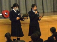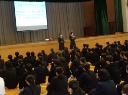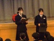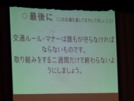 今日の生徒朝会では生徒会本部が「安全に、マナーよく登下校しよう」と呼びかけました。事前にアンケートを実施し、まとめた「登下校中の迷惑行為」を紹介し、これらのことをなくしていこうと呼びかけました。また「道路交通法」の改正点を紹介し、自転車の乗り方についても理解を深めました。今週と来週の2週間を「登下校安全期間」として、継続した呼びかけや実態と改善を把握するアンケートを実施します。
