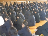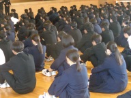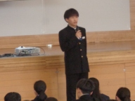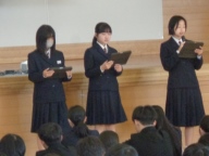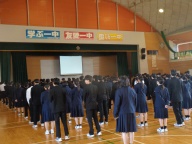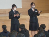 最初に今年度の生徒会スローガンが伝えられました。「一中団結~笑顔が咲く学校~」です。「一中団結」は「いっちだんけつ」と読み、今年度、一中生徒が一つになってより良い一中を目指す強い想いが込められています。
