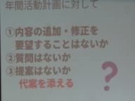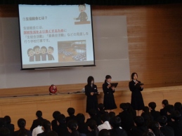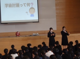 続いて「生徒総会議案書」「学級討議」「生徒総会」について、その目的や内容、進め方を生徒会本部が丁寧にわかりやすく伝えました。初めての1年生にとっても優しい配慮です。今週末の模擬学級討議を経て、来週月曜日に学級討議を行います。