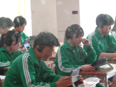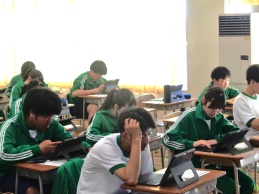 今日は英語の「読むこと」「書くこと」「聞くこと」の調査です。問題提示や解答はすべてタブレット端末を使用します。「聞くこと」はヘッドフォンを付けて行います。