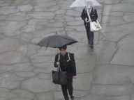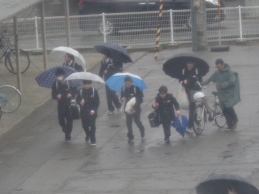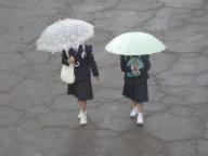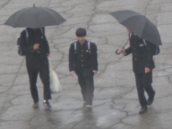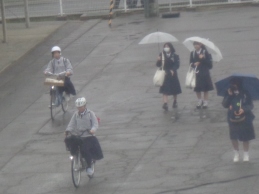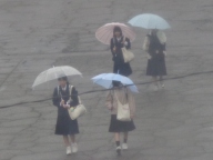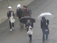 朝から雨が降るあいにくの空模様です。生徒は傘をさしたり、雨具を着たりしての登校です。下校の頃には雨が上がることを願っています。