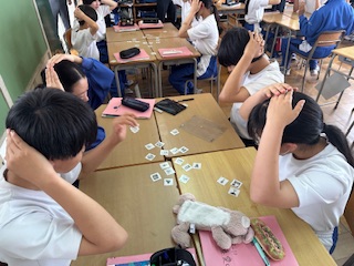 英語 英語で先生が単語の説明をして該当するカルタを探しました。 数学 根号を含む式の計算方法をグループで検討します。電卓で検算も。 社会 学習の振り返り。じっくりまとめたノートが役に立っています。