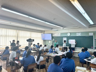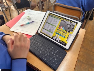 英語の教科書に戦争と平和が題材の単元があります。学びを通して戦争や平和について考えたことを留学生に伝えたり質問したりしました。ノートには英語で自分の考えを伝えたり質問したりするためのメモがびっしりと …