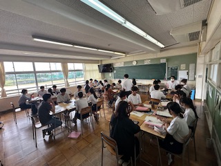 防災士の皆さんにおいでいただき、3回にわたって防災について学習します。1回目は、地域に貢献する防災士さんの役割や熱い思いをお聞きしたり、下山中学校区の災害リスクをハザードマップで確認したりしました。
