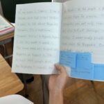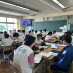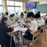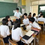 英語の教科書に戦争と平和が題材の単元があります。学びを通して戦争や平和について考えたことを留学生に伝えたり質問したりしました。ノートには英語で自分の考えを伝えたり質問したりするためのメモがびっしりと書き込まれていました。