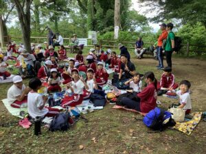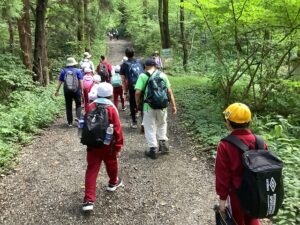 昨年はクマの出没の影響で,急遽弥彦山登山となりましたが、今年は例年のコースに戻し,全校で護摩堂山まで歩き,護摩堂山を登り下りする「全校登山」を行いました。約3時間ほどの行程を,縦割り班で声を掛け合いながら,一人の脱落者も出さずにやり切りました。 頂上にたどり着いた後のお弁当の味は,やはり格別なものでした。子どもたちは,みんなとおしゃべりしながらお弁当を食べて,楽しいひと時を過ごしました。 その後,縦割り班ごとに5年生が考えた遊びを行いました。頂上まで歩いて疲れていても,昔懐かしい「花いちもんめ」を楽しんでいた班もありました。 全部で約10㎞の道のりを歩き,帰りはバスで帰校しました。事故やけがもなく,予定通り行えたのも,集まってくださった約20名ものボランティアさんの温かい見守りのおかげと感謝しております。子どもたちのために,一緒に寄り添っていただきありがとうございました。