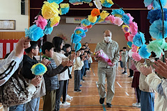 本日、離任式を行いました。校長から異動になる職員を紹介した後、代表児童からあいさつ、花束の贈呈、校歌斉唱を行い、最後は花のアーチを作って見送りました。これまでお世話になった皆様に心より感謝申し上げます。