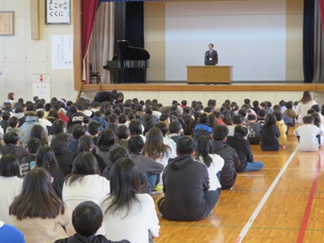 全校朝会が行われ、校歌を斉唱し、新年のあいさつの後、校長先生のお話をお聴きしました。
