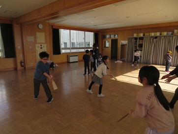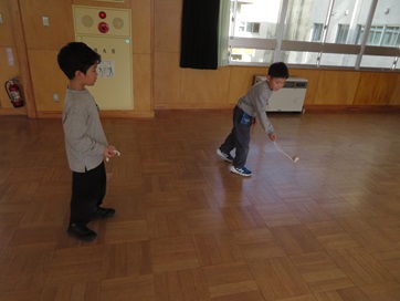 令和8年1月16日(金)1年生が道徳の時間に「けん玉」「羽根つき」「あやとり」「こま回し」「達磨落とし」の昔の遊びを体験しました。