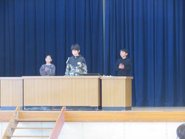校歌斉唱の後、後期頑張ったことと来年度頑張ることを三人の代表児童が発表しました。