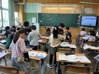 友達と意見を交流しながら学びます。図書館の利用も始まります。