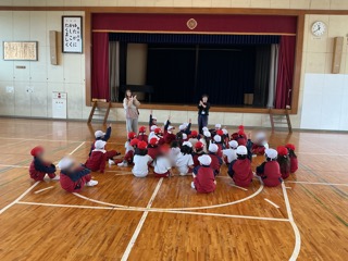 1年生が始めて体育館で体育をしています。広い体育館いっぱいを使って鬼ごっこをしていました。