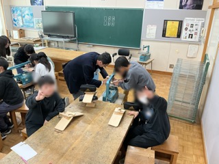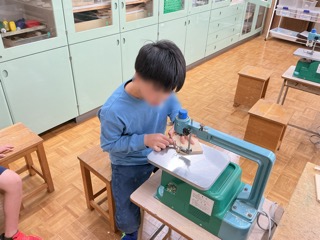 5、6年生は、図工でも色々な道具を使って製作活動をします。今日は電動糸鋸を使って、テープカッターづくりに取り組んでいました。