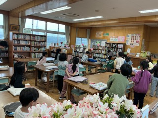 1年生が図書館利用を始めました。今日は、5冊借りることができます。