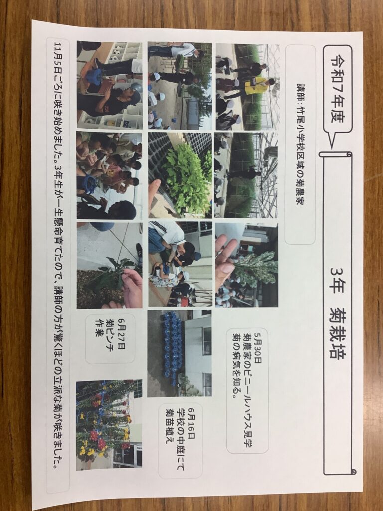 3年生が総合的な学習の時間に、スプレー菊を育てています。近所にお住まいの菊栽培の専門家に、育てるために大切なことを教えていただいています。