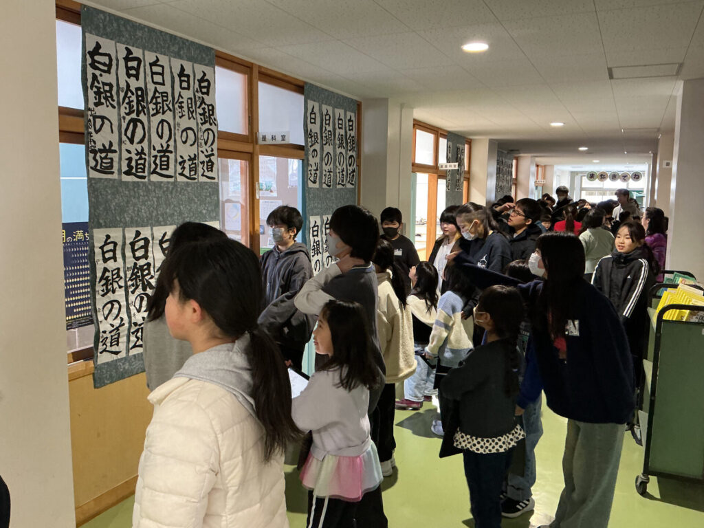 2月5日の学習参観日に合わせて書き初めを展示しました。 1年生と6年生、2年生と5年生、3年生と4年生のペア学年で、書き初めの鑑賞会を行いました。