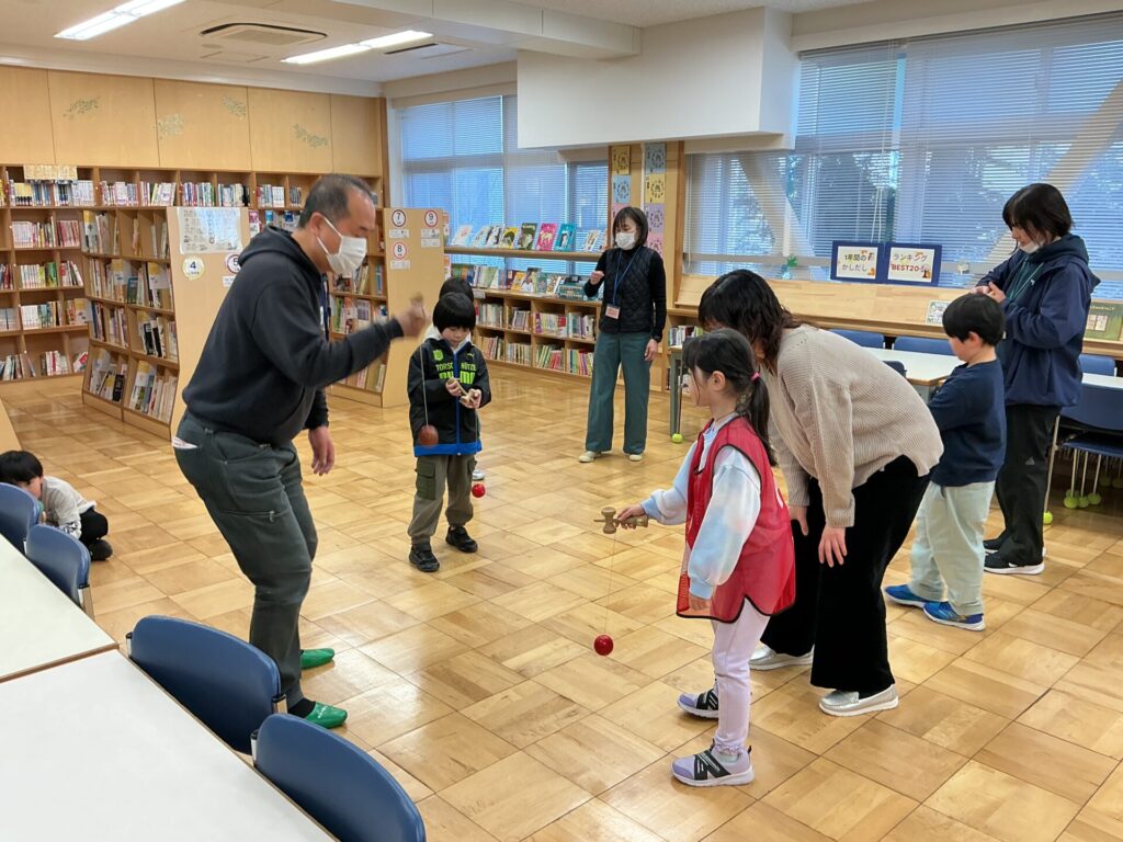 けん玉、あやとり、お手玉、紙鉄砲、こま、がっちゃん将棋のゲストティーチャーをお招きして、1年生の生活科の「昔遊び」をしました。