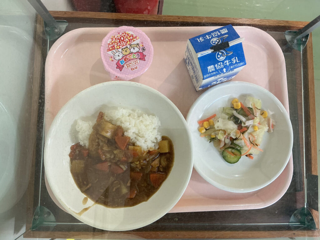 メニューは、ポークカレー、ハムとコーンのサラダ、お祝いゼリーなどでした。