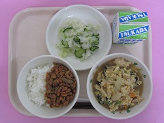 ☆本日のメニュー・ごはん・高野豆腐入り親子煮・鉄火味噌・たくあんあえ・牛乳 【新潟市の食材】米・小松菜・きゅうり・ごぼう・キャベツ・たくあんのだいこん【新潟県の食材】牛乳【その他】   にんじん・ …