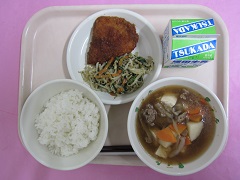 ☆本日のメニュー・ごはん・いものこ汁・ぶりたれカツ・ごまびたし・牛乳 【新潟市の食材】米・長ねぎ・ごぼう・ほうれんそう【新潟県の食材】牛乳・里いも・にんじん・もやし【その他】 ぶり(国産)