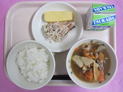 ☆本日のメニュー・ごはん・筑前煮・厚焼き玉子・大根のツナあえ・牛乳 【新潟市の食材】米・だいこん・こまつな【新潟県の食材】牛乳・ごぼう・れんこん・里いも【その他】 にんじん(茨城)