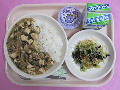 ☆本日のメニュー・ごはん・マーボー丼・春雨サラダ・ぶどうゼリー・牛乳 【新潟市の食材】米・長ねぎ・にんじん・きゅうり【新潟県の食材】牛乳・キャベツ・豚肉【その他】 にら・生姜(高知) にんにく …