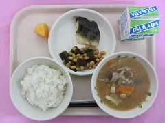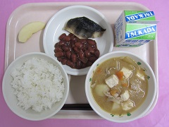 ☆本日のメニュー・ごはん・豚汁・ほっけの塩焼き・金時豆の甘煮・りんご・牛乳 【新潟市の食材】米・だいこん・長ねぎ【新潟県の食材】牛乳・ごぼう・豚肉【その他】 にんじん・じゃがいも(北海道) り …