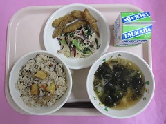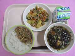 ☆本日のメニュー・ごはん・もずくスープ・アーモンド入り ちりめんじゃこの佃煮・じゃがいものきんぴら・牛乳 【新潟市の食材】米・こまつな・長ねぎ・ごぼう【新潟県の食材】牛乳・えのき・豚肉【その …