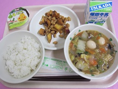 ☆本日のメニュー・ごはん・うずら卵入り八宝菜・さつまいもと大豆の揚げ煮・ルレクチェゼリー・牛乳 【新潟市の食材】米・チンゲンサイ【新潟県の食材】牛乳・豚肉・ルレクチェ【その他】 にんじん・たま …