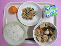 ☆本日のメニュー・ごはん・うずら卵入りみそおでん・きりざい・みかん・牛乳 【新潟市の食材】米・にんじん・こまつな【新潟県の食材】牛乳・里いも・だいこん【その他】 みかん(和歌山)
