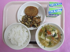 ☆本日のメニュー・ごはん・けんちん汁・レバー入りメンチカツ・切り昆布の煮つけ・牛乳 【新潟市の食材】米・長ねぎ・小松菜【新潟県の食材】牛乳・にんじん・れんこん【その他】 じゃがいも(鹿児島) …