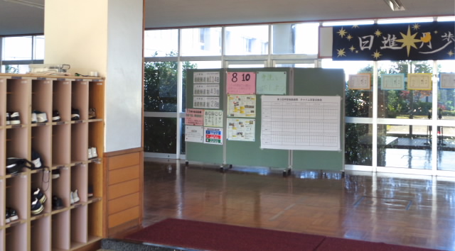 生徒玄関に大きな掲示物が登場しました。 躍進会の生活委員会が「チャイム学習(着席)」の点検を始めたようです。撮影した今朝の段階では、昨日の結果がまだ記入されていませんでしたが、「授業を受け …