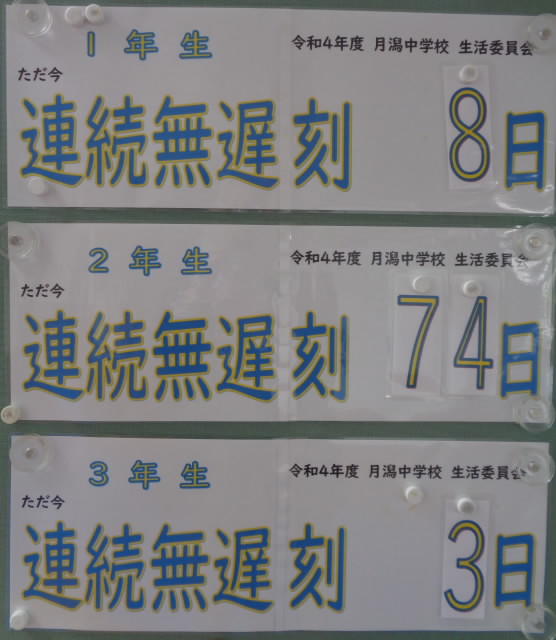 きのうの状況です。 8月終わり頃に「71」で連続が途絶えた2年生でしたが、その後はまた順調に無遅刻を続け、以前の数値を上回って冬休みに突入しました。頑張っていましたね。 全校生徒のみなさん。冬休み …