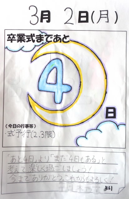 3月になりました。今月の生活目標は… 今年度最後の1カ月です。総まとめ、次への備え。1日1日、自分の目標にそって取り組むことを具体的に決めて、「今日は〇〇をした」「◇◇ができた」と言えるように過 …