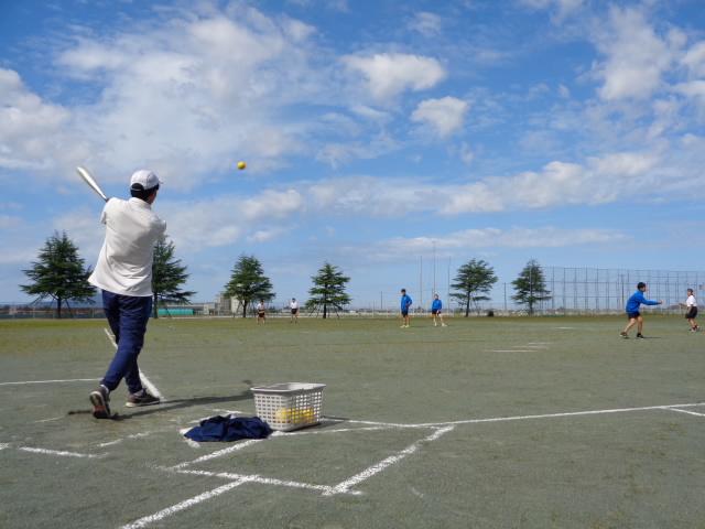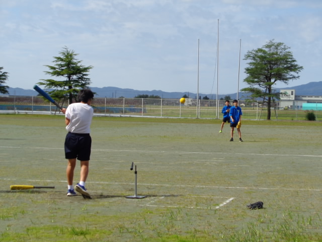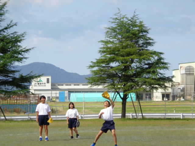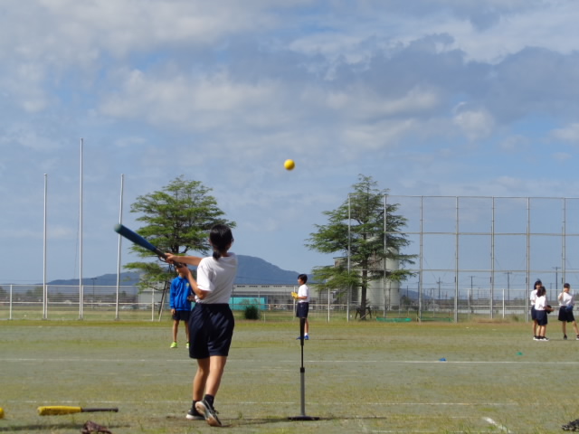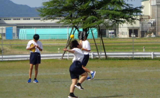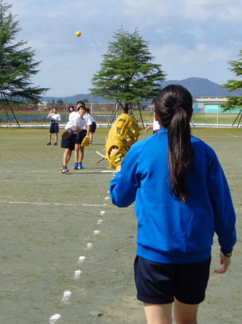 さわやかな秋晴れの下、1年生が保健体育の授業でソフトボールをしていました。バッターではありませんが外に行ってみました。
