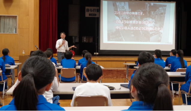 全校総合「防災学習」(全4回8時間)をスタートさせました。講師として、NPO法人ふるさと未来創造堂の 中野 雅嗣 様 をお迎えし、専門的なお立場から実践的なお話をお聴きしました。