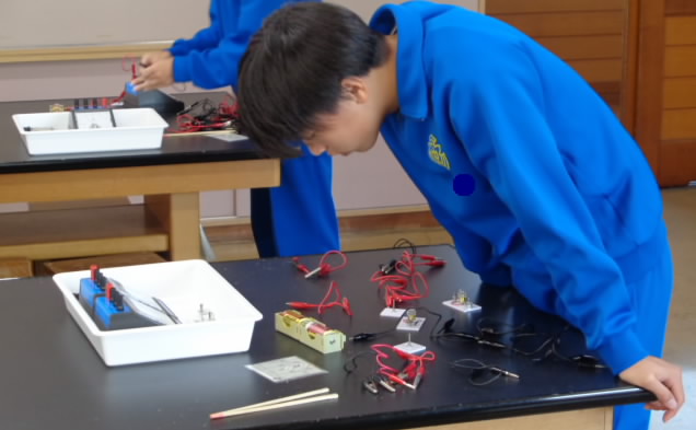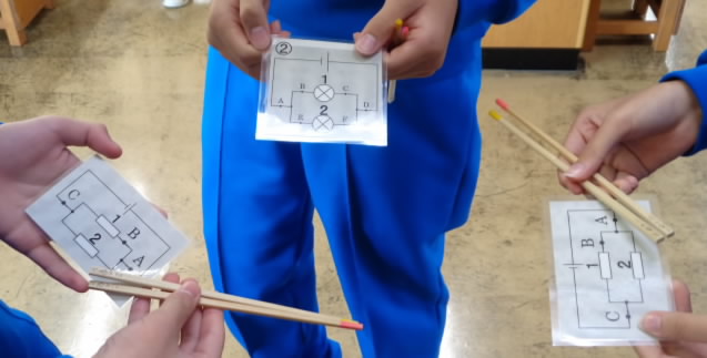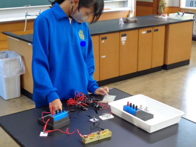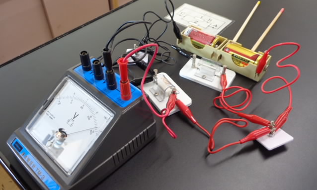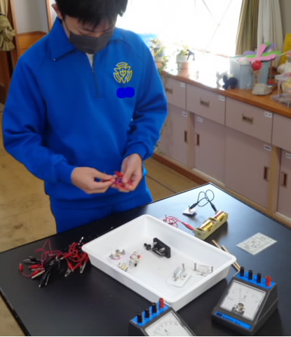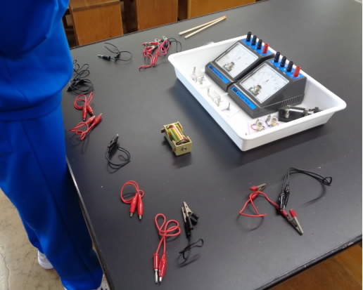 本日1限、2年生理科「電流回路」の授業で実技テストをしていました。選び取ったカードに示された回路をつくり、指定された箇所の電流・電圧を測定するというものです。制限時間は5分。