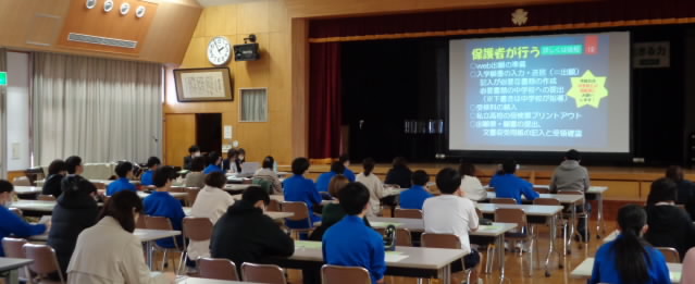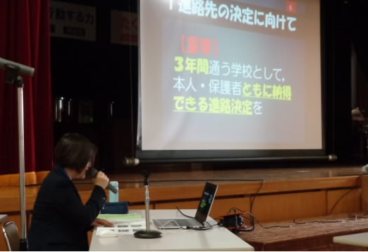 本日28日(金)午後、「進路説明会」を開催しました。保護者・ご家族のみなさんも大勢参加してくださり、3年生と一緒に進路指導主事からの説明を聞いてくださいました。