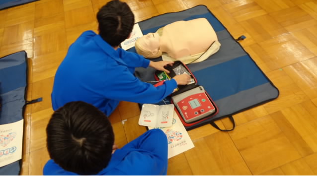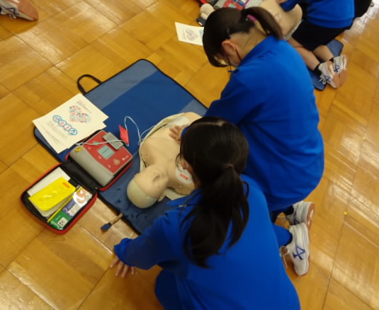 説明動画を視聴した後、胸骨圧迫やAEDでの電気ショックなど、実際の対応の流れに従って体験活動を行いました。