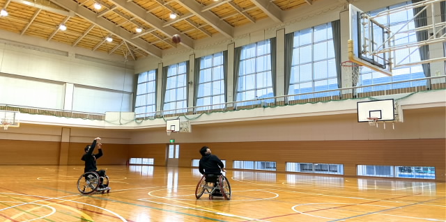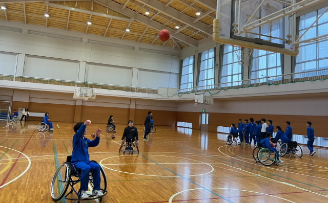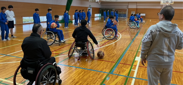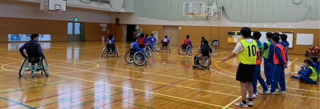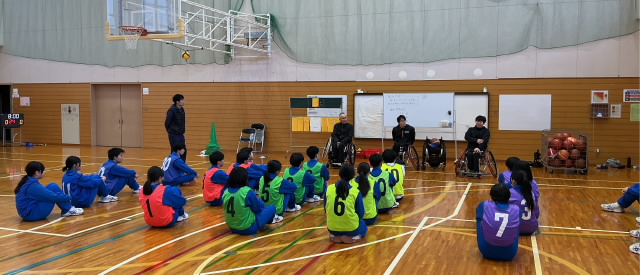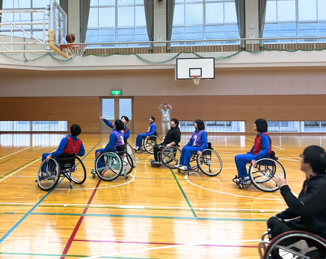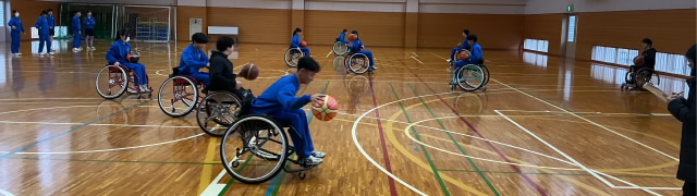 講師のみなさんと顔合わせをした後、「車いすバスケットボールとそのルール」の講義や「車いすの操作~ドリブル~シュート」の練習を行いました。