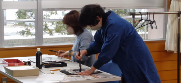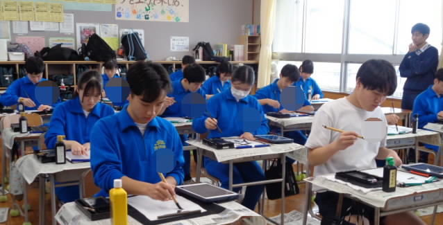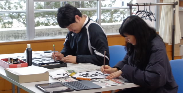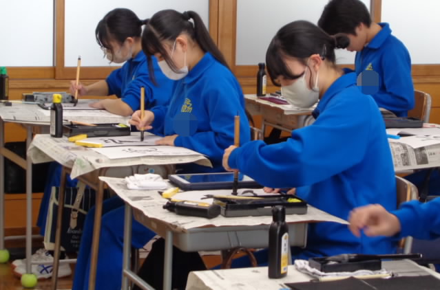 生徒たちは、冬休み中にまとめてきたアイディアにそって、思い思いに書に取り組みました。