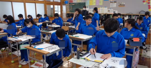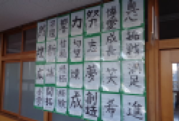 昨日午後、全校で書初めを行いました。新年の決意を表す漢字を、毛筆で半紙に書きました。