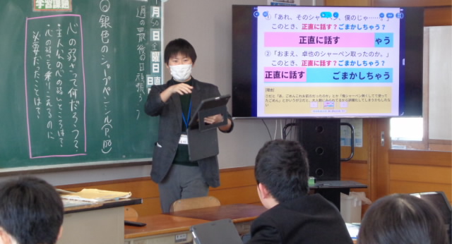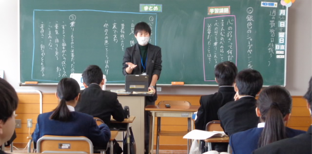 本日1限、初任者研修の一環で、1年生学級担任が道徳の授業を公開しました。